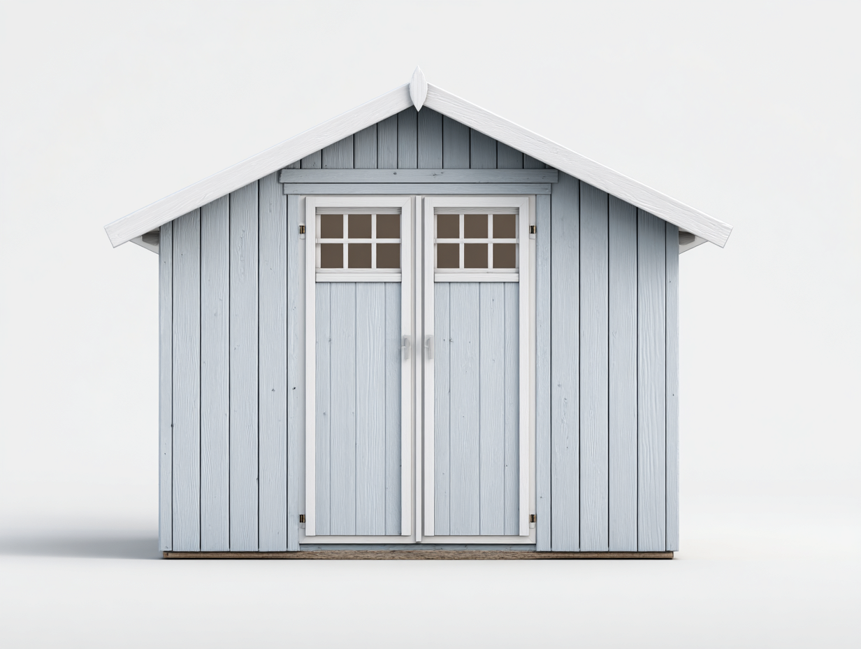 The shed is constructed from wood with a light blue exterior finish complemented by white trim and roof edges. Vertical wooden panels enhance structural stability, while the pitched roof supports efficient rainwater runoff for outdoor use.